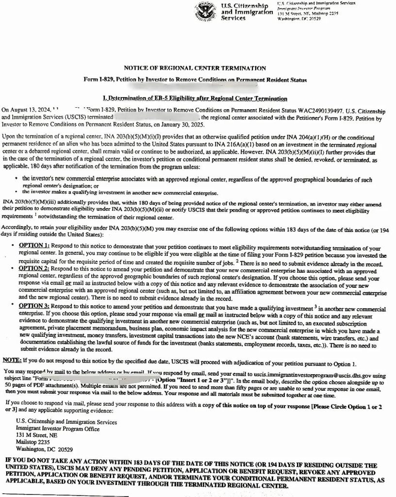 这次,就是该条款自新法生效以来的初次大规模应用。根据移民局的通知,收到信函的投资人有 180 天的窗口期,从以下三个选项中择一回复: