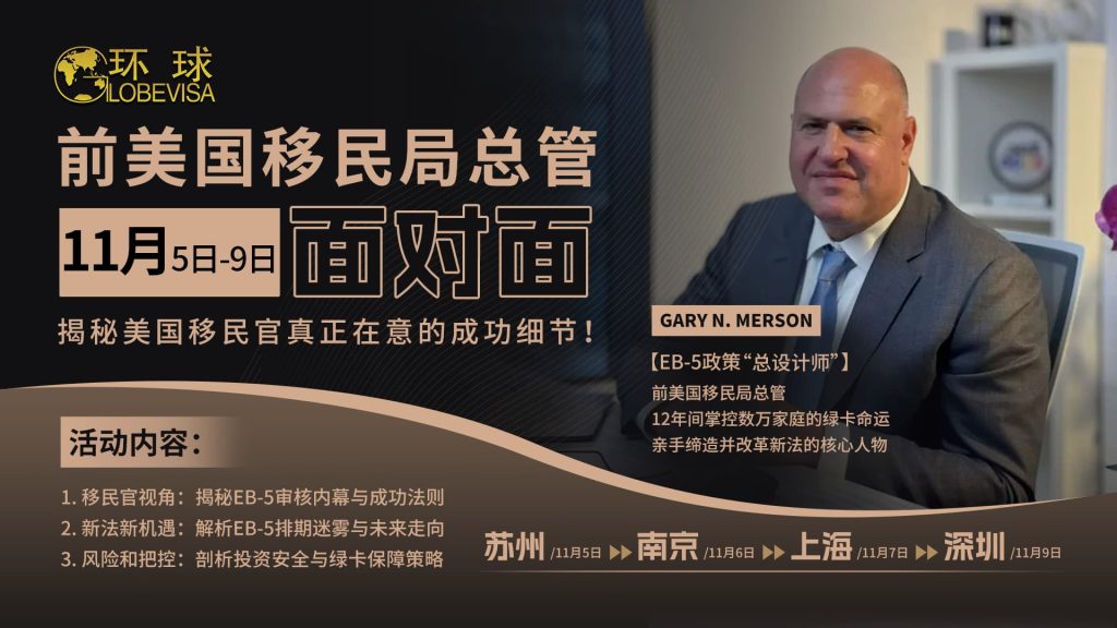 2025年11月,环球出国为您奉上两场含金量爆棚的美国移民盛宴——前美国移民局总管、EB-5政策“总设计师”Gary N. Merson面对面揭秘美国移民官真正在意的成功细节。美国TOP移民律师Oliver Yang深度解析EB-5政策,直击“无排期绿卡”机遇!两场活动覆盖8大城市,无论您关注政策走向、快速获批还是项目选择,都能找到专属答案。