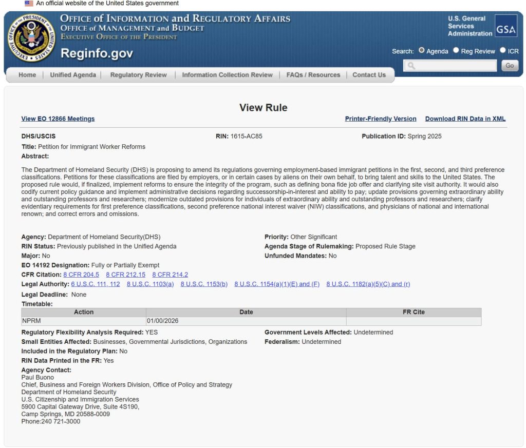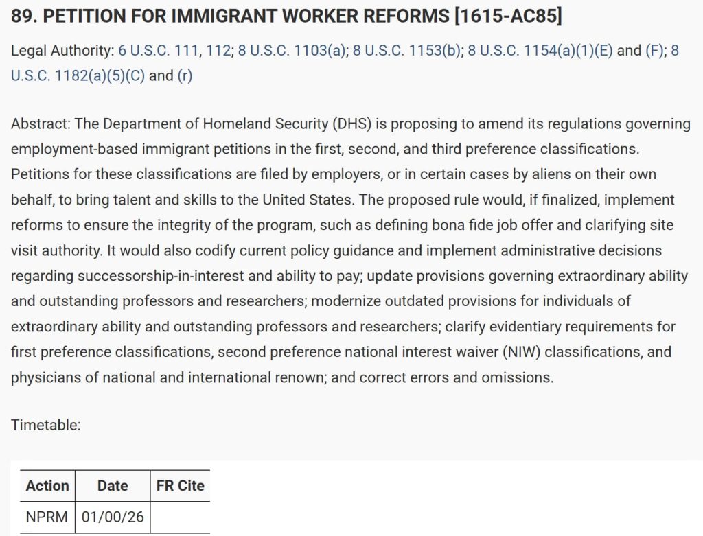 根据美国国土安全部发布的《统一联邦法规议程》(Unified Agenda of Federal Regulatory and Deregulatory Actions),1615-AC85号改革计划的《拟议规则制定通知》(Notice of Proposed Rulemaking)将于2026年1月在联邦公报上发布,进行公示。