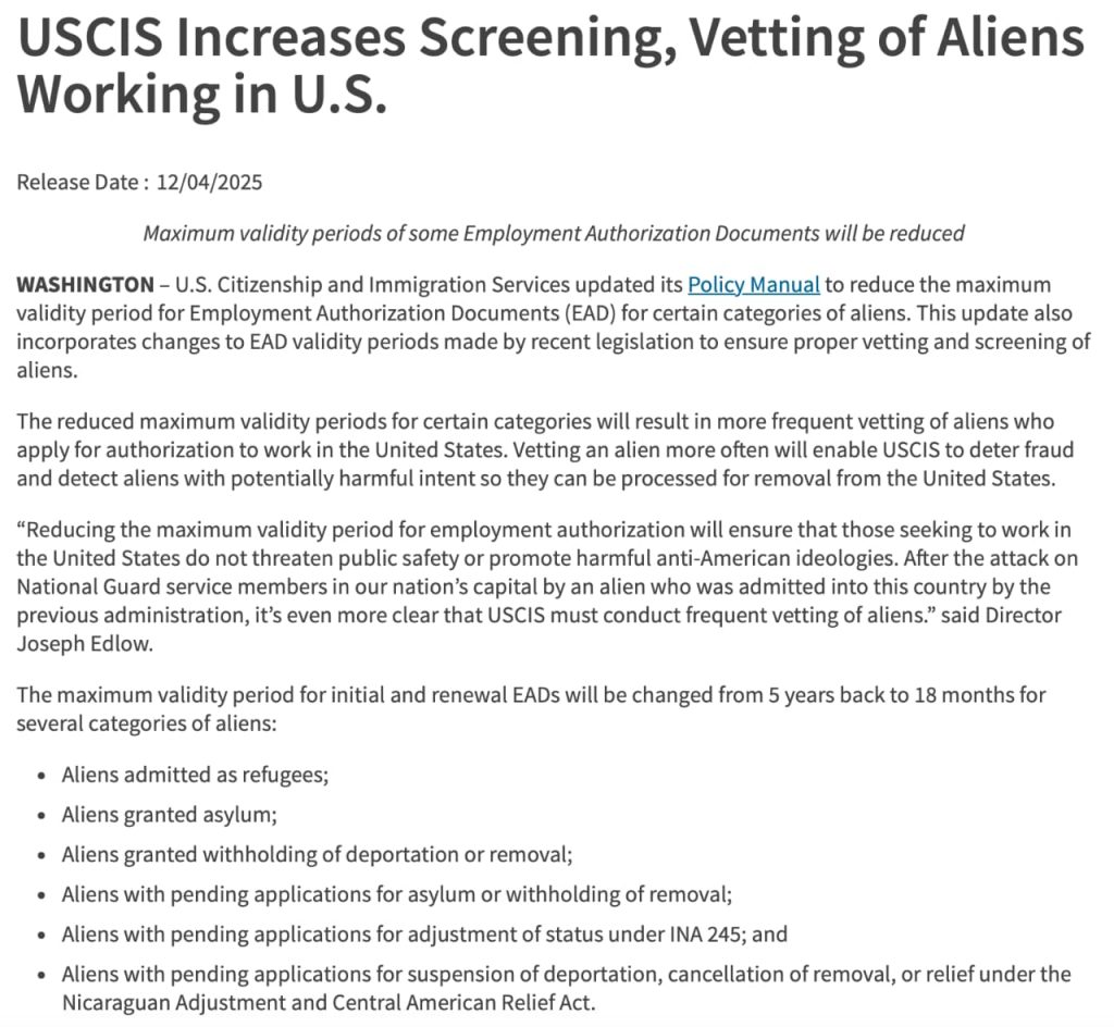 2025年12月4日起,出于“加强安全审查”的需要,移民局将大幅缩短EAD工卡(工作许可文件)的有效期,由5年缩短至18个月。正式生效时间为2025年12月5日,审批中和新递交的EAD工卡申请都将按照新规审核。