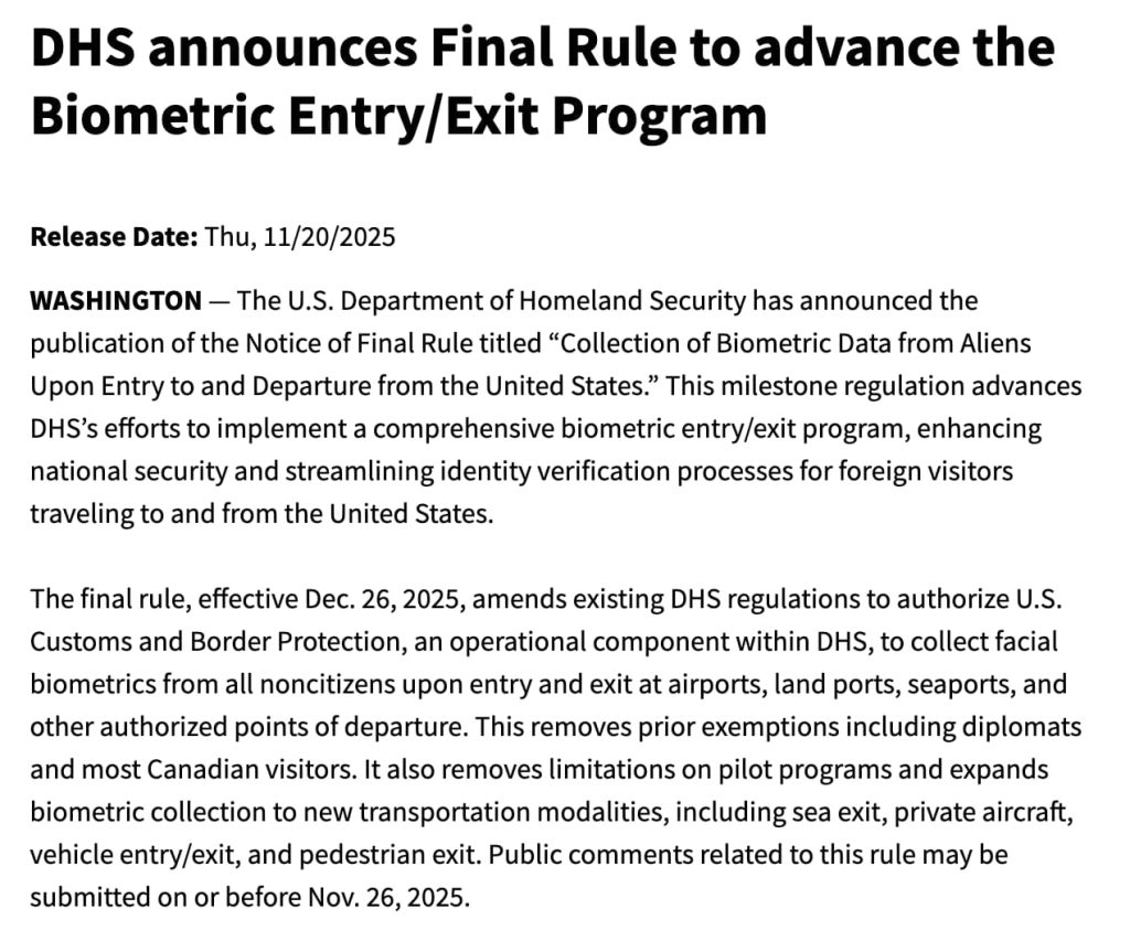 美国国土安全部(DHS)发布重磅消息,确认将于2025年12月26日起全面推进生物识别出入境系统。与此同时,移民局也在升级内部审查机制。