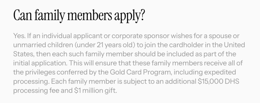 在EB-5项目中,一份80万美元的投资,涵盖了主申请人、配偶及21岁以下未婚子女,全家拿绿卡。但在特朗普金卡的FAQ中明确写道: