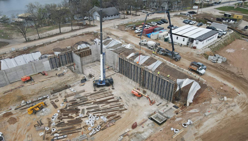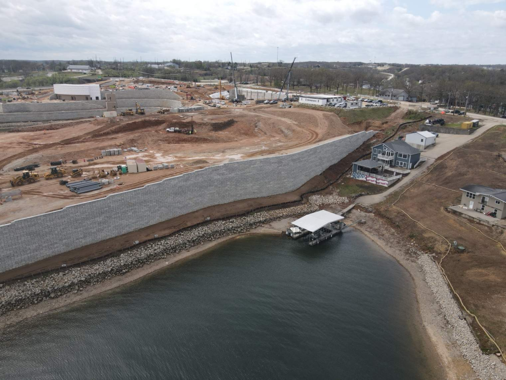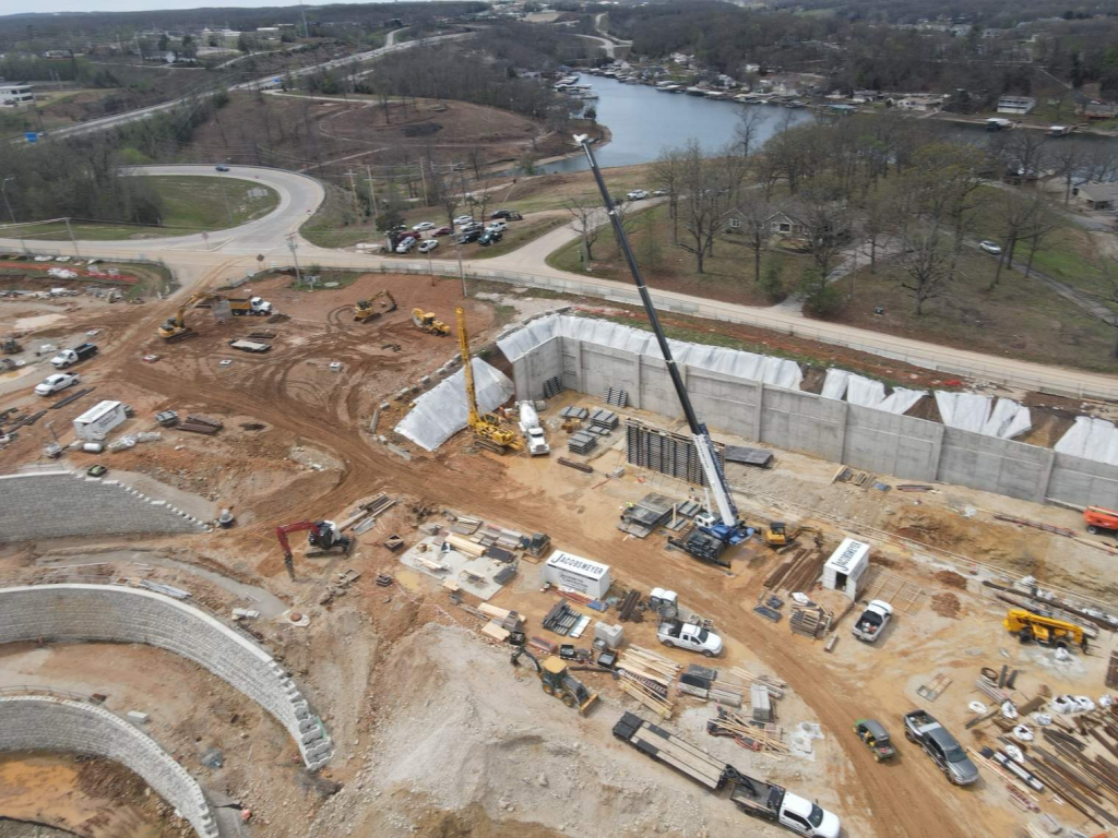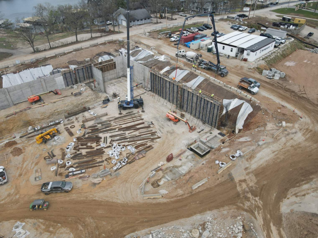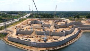 现场正处于土建阶段:已顺利完成地基打桩及湖畔挡土墙 (retaining wall)等前期地面基础施工工作;电力公司Ameren已搬迁电线杆,接下来是爆破和岩石作业。